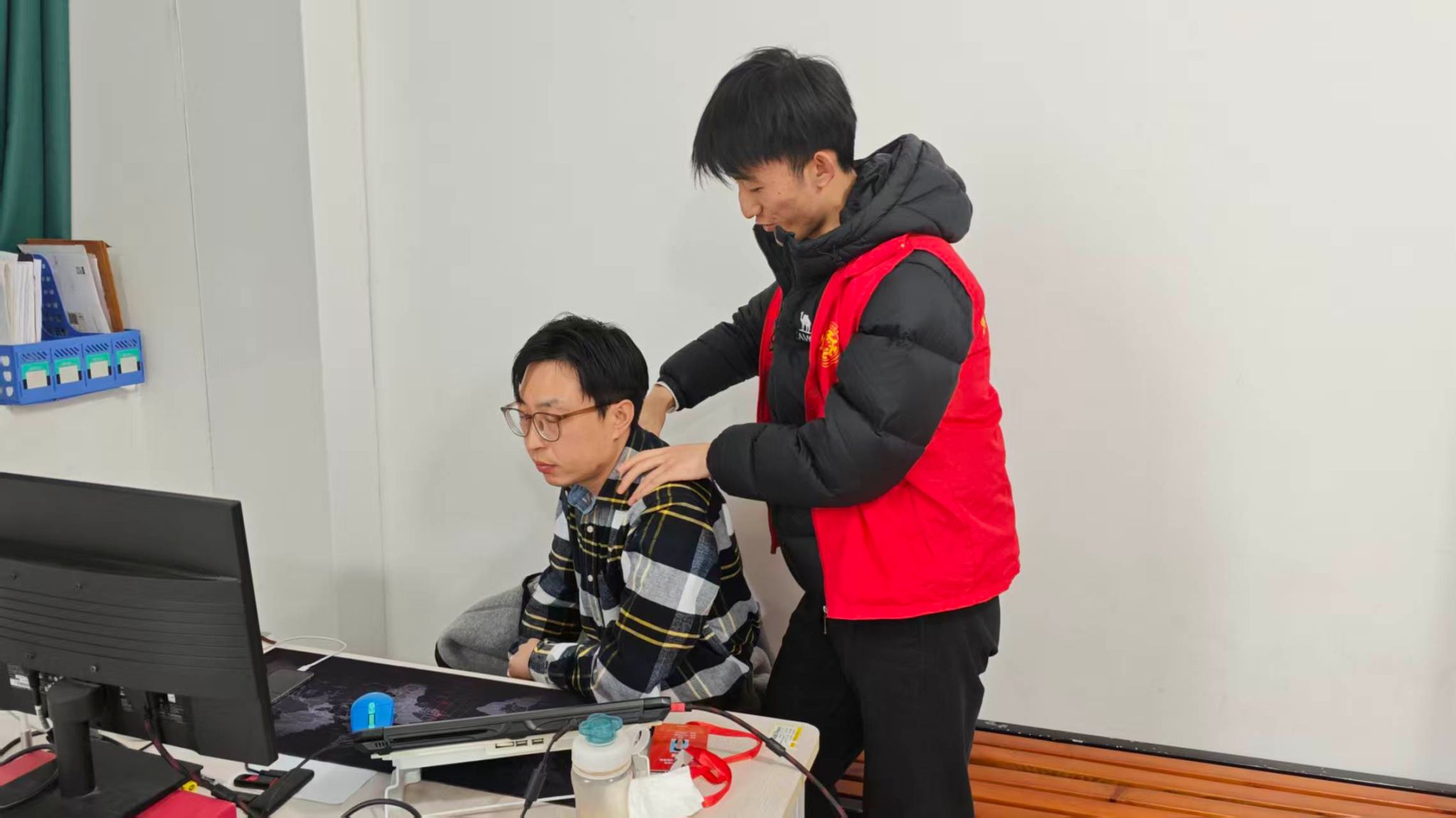 体育学院发挥专业优势,组织具备按摩技能的学生志愿者,在校园活动室、教职工办公室开展“温暖颈肩”志愿按摩服务,为教职工及后勤、安保人员送去关怀,缓解其颈肩疲劳,用专业传递温情,以行动诠释雷锋精神,赢得一致好评。