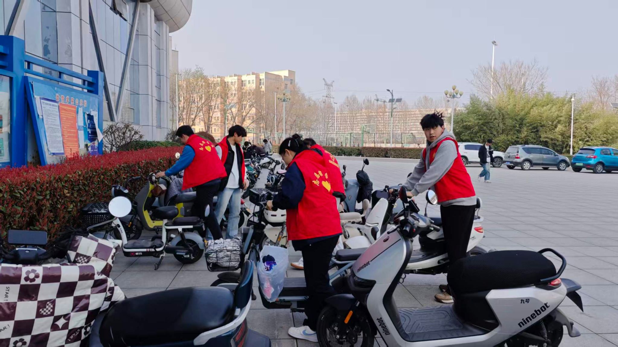 体育学院组织志愿者前往体育馆门口,开展电动车规范摆放志愿服务,有序整理乱停车辆,分担值班人员工作压力,规范校园交通秩序,让志愿服务融入校园细节。