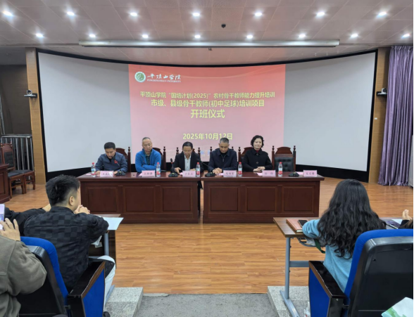 2025年10月12日下午,平顶山学院“国培计划(2025)”农村骨干教师能力提升培训——初中体育足球市级、县级骨干教师培训开班仪式在湖滨校区2106多媒体教室举行。平顶山学院副校长于长立教授、继续教育学院院长马书军教授、体育学院院长王继强教授(项目首席专家)、继续教育学院副院长任玮、体育学院副院长王兵柯出席仪式,仪式由王兵柯主持,100名来自全省各地的市级、县级初中体育足球骨干教师共同参训。仪式后“开班第一课——体育教师使命担当”同步开讲,为本次培训奠定专业与思想双重基石。